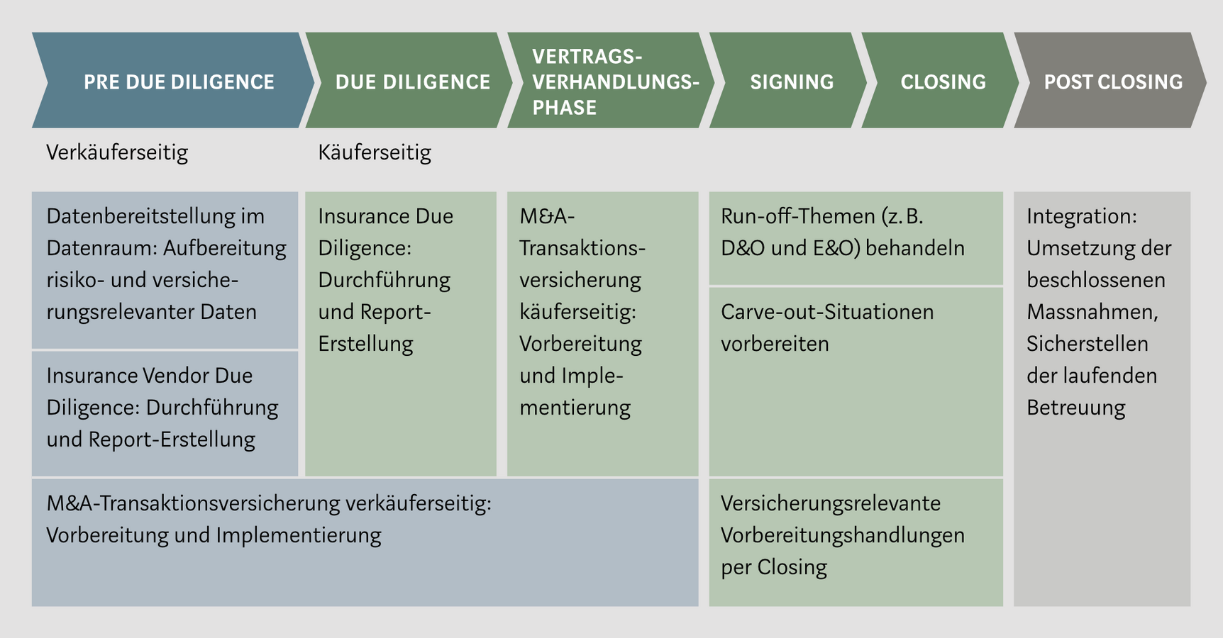 Kessler bietet Ihnen Dienstleistungen für sämtliche Versicherungsbelange wie betriebliche Versicherungen, Personenversicherungen und Pensionskasse. Insbesondere im M&A-Prozess reichen sie von der Vorbereitung der Transaktion (Informationsbereitstellung und Vendor-Due-Diligence) über die eigentliche Prüfung des Zielunternehmens (Insurance-Due-Diligence) zum Transfer von Risiken aus dem Unternehmenskaufvertrag (M&A-Transaktionsversicherung) bis hin zur Begleitung bei der Integration oder bei einem Wiederverkauf.